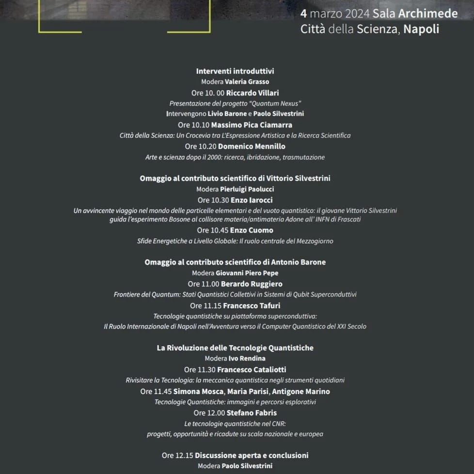 L’apertura di questa serie di appuntamenti non poteva non partire dalle figure simbolo di due grandi scienziati, anticipatori della nuova consapevolezza che si sta diffondendo: Antonio Barone e Vittorio Silvestrini, due pionieri, eccellenze del mondo accademico. Per celebrare il loro importante lavoro scientifico numerosi interlocutori, scienziati a vario titolo, provenienti da tutt’Italia, hanno dato la loro disponibilità a partecipare come relatori a questo primo appuntamento tra i quali: il Prof. Enzo Iarocci già Presidente INFN-, Stefano Fabris Direttore del Dipartimento di Scienze Fisiche e Tecnologie della Materia del CNR, nonché i responsabili nazionali delle ricerche sulle Tecnologie Quantistiche finanziate dal PNRR ovvero Prof Francesco Tafuri e Prof Francesco Cataliotti, i quali hanno riportato i più recenti risultati sullo stato di avanzamento di queste importanti progettualità per l’ Italia”